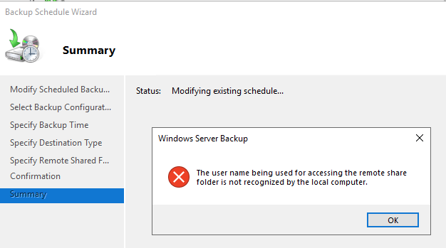 This is a strange message to me. Behind the scenes though, and I’ll test my theory later, that I’m logged into Windows in an account that already has a network connection, mapped drive to that remote fileshare, using my own remote username. And I’m using a different remote login for backups. I think Windows Backup, is trying to test that the remote username I typed into this Backup Schedule Wizard, that it actually works. But Windows cannot make a second connection to the remote share using a different account. That’s my theory for now.