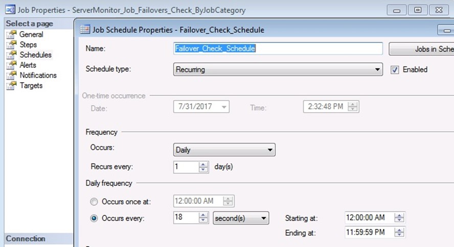 I scheduled it to run every 18 seconds; you may want a longer interval, maybe every 1 minute instead. The longer you make this interval, the more possibility that when a HADR failover occurs, a SQL Job may start on the wrong server and fail (because database not available).