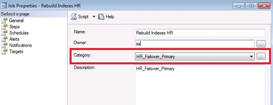 We will use Job Categories, in SQL Agent, to categorize the jobs we want to fail over. Create the Job Categories on the PRIMARY node.