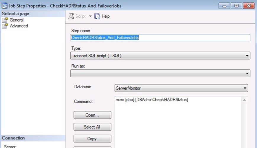 Step 7. Create and Schedule a Job, on each Node, to Monitor HADR status.